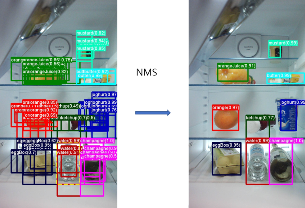 3. 출력된 데이터 중 어떤 데이터가 실제 물체를 인식했는지 확인하기 위해 IOU값을 사용한다. ( NMS알고리즘 사용) 주변의 데이터들과 비교했을 때 최대값인 데이터만 추출한다.