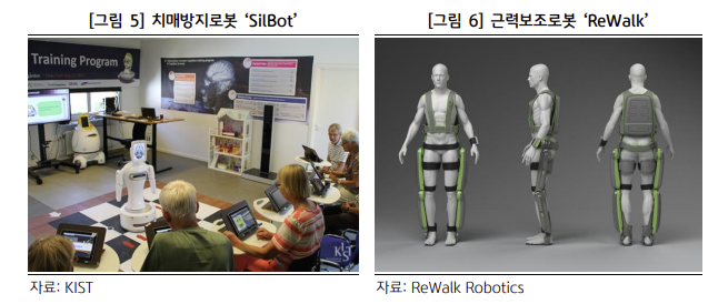 실버케어 로봇은 개인의 활동 보조, 우울증 해소를 위한 개인 로봇 서비스를 제공하고, 전문서비스용 로봇은 원격진료, 거동이 불편하거나 근력보조를 통해 업무 효율을 높여주는 로봇 슈트등으로 활용되고있다.