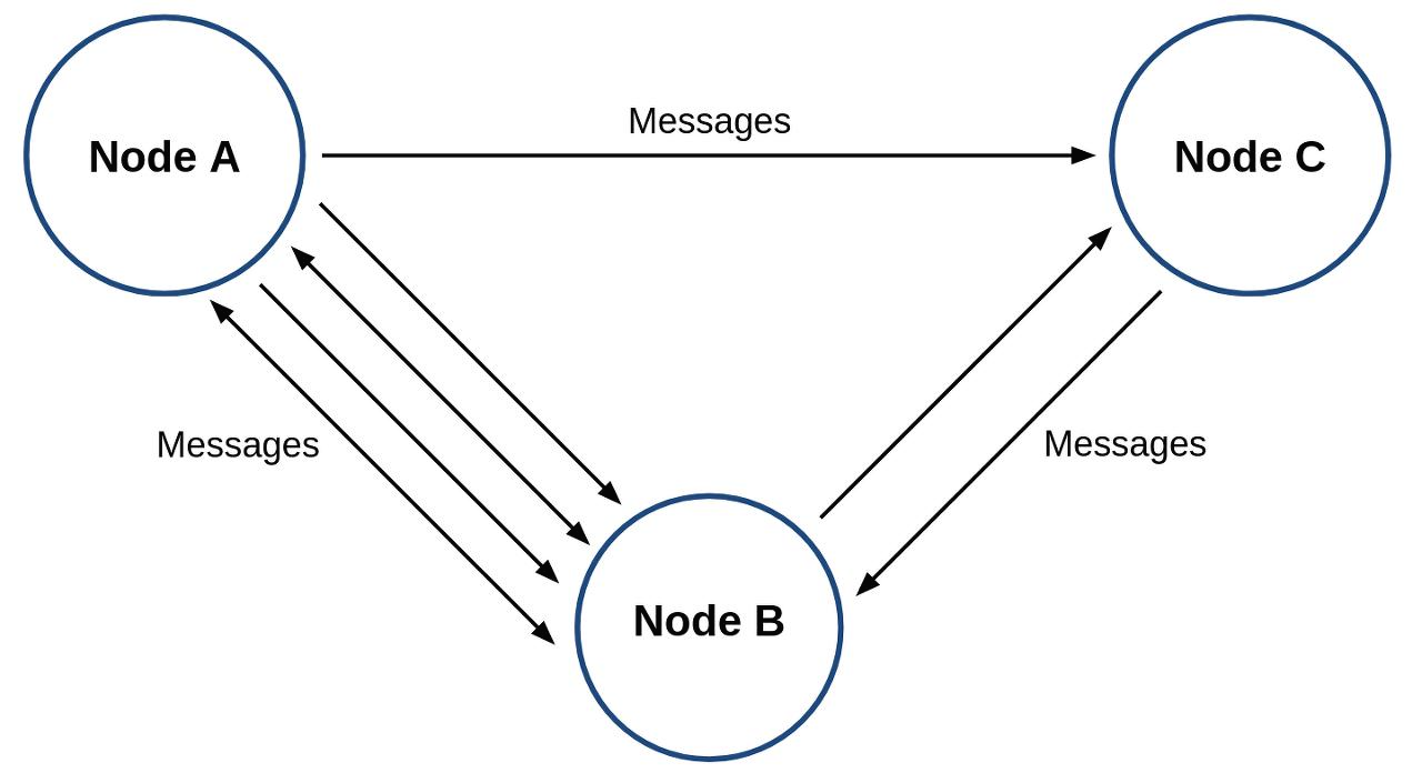노드(node)는 아래의 그림처럼 Node A, Node B, Node C라는 노드가 있을 때 각각의 노드들은 서로 유기적으로 Message로 연결되어 사용된다. 수행하고자 하는 테스크가 많아질수록 메세지로 연결되는 노드가 늘어나며 시스템이 확장될 수 있게된다.