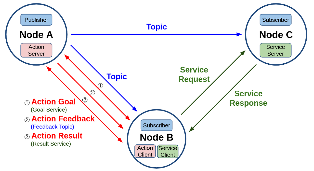 액션(Action)은 `Node A - Node B`처럼 비동기식+동기식 양방향 메시지 송수신 방식으로 액션 목표 Goal를 지정하는 Action client과 액션 목표를 받아 특정 태스크를 수행하면서 중간 결괏값에 해당되는 액션 피드백(Feedback)과 최종 결괏값에 해당되는 액션 결과(Result)를 전송하는 Action server 간의 통신이라고 볼 수 있다. 액션의 구현 방식을 더 자세히 살펴보면 그림 5와 같이 토픽(topic)과 서비스(service)의 혼합이라고 볼 수 있는데 액션 목표 및 액션 결과를 전달하는 방식은 서비스와 같으며 액션 피드백은 토픽과 같은 메시지 전송 방식이다. 액션 목표/피드백/결과(Goal/Feedback/Result) 메시지 또한 위에서 언급한 msg 메시지의 변형으로 action 메시지라고 한다.