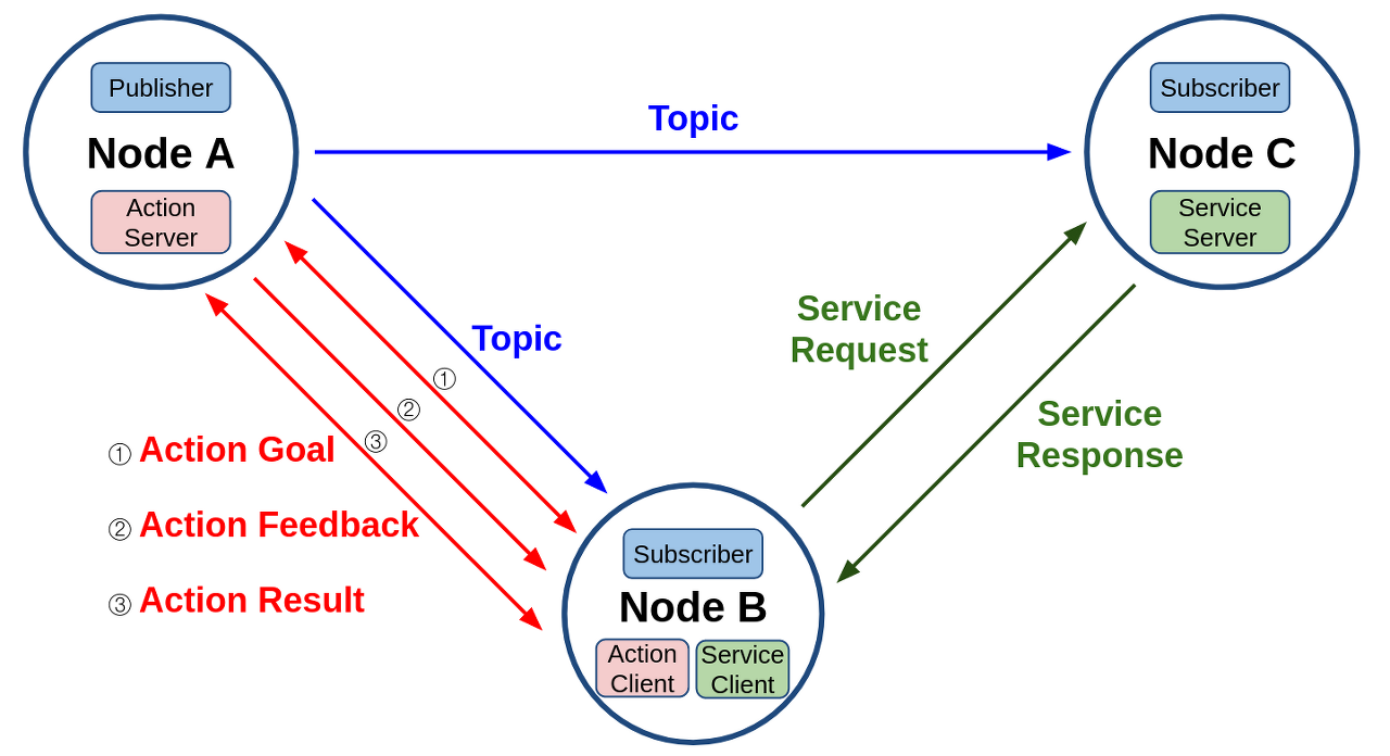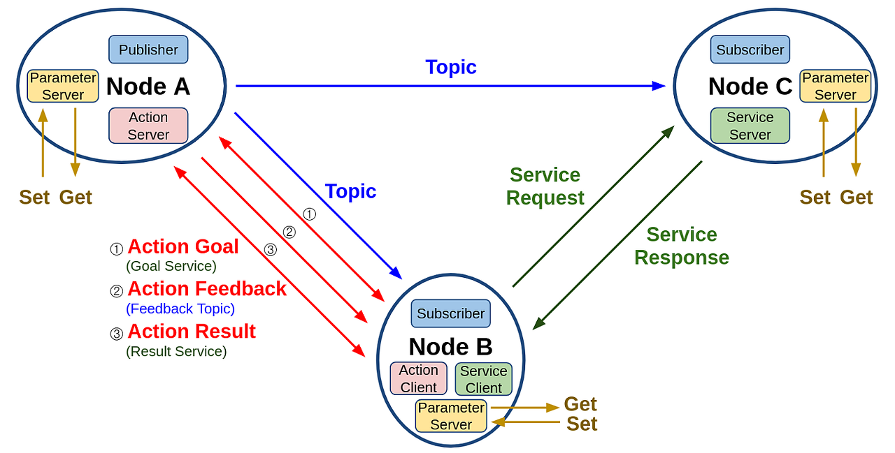 노드들 간의 메세지가 토픽, 서비스, 액션, 파라미터이다.
