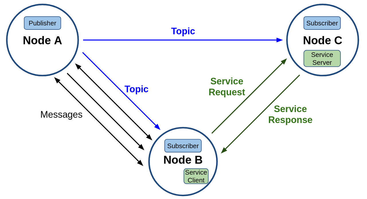 서비스(Service)는 아래의 그림과 같이 `Node B - Node C`처럼 동기식 양방향 메시지 송수신 방식으로 서비스의 요청(Request)을 하는 쪽을 Service client라고 하며 서비스의 응답(Response)을 하는 쪽을 Service server라고 한다. 결국 서비스는 특정 요청을 하는 클라이언트 단과 요청받은 일을 수행 후에 결괏값을 전달하는 서버 단과의 통신이라고 볼 수 있다. 서비스 요청 및 응답(Request/Response) 또한 위에서 언급한 msg 메시지의 변형으로 srv 메시지라고 한다.
