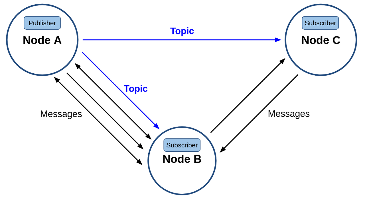 토픽(Topic)은 아래와 같이 `Node A - Node B`, `Node A - Node C`처럼 비동기식 단방향 메시지 송수신 방식으로 msg 메시지 형태의 메시지를 발간하는 Publisher와 메시지를 구독하는 Subscriber 간의 통신이라고 볼 수 있다. 이는 1:N, N:1, N:N 통신도 가능하며 ROS 메시지 통신에서 가장 널리 사용되는 통신 방법이다.