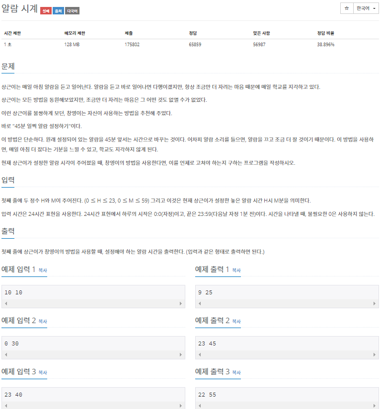 // 만약 입력받은 분이 45분 미만일 경우