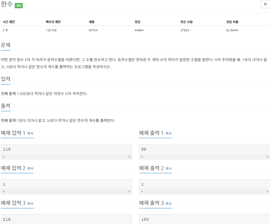 1~99까지는 무조건 한수이고, 두 숫자가 등차수열을 이루는 것을 찾아내면 되는 문제이다.