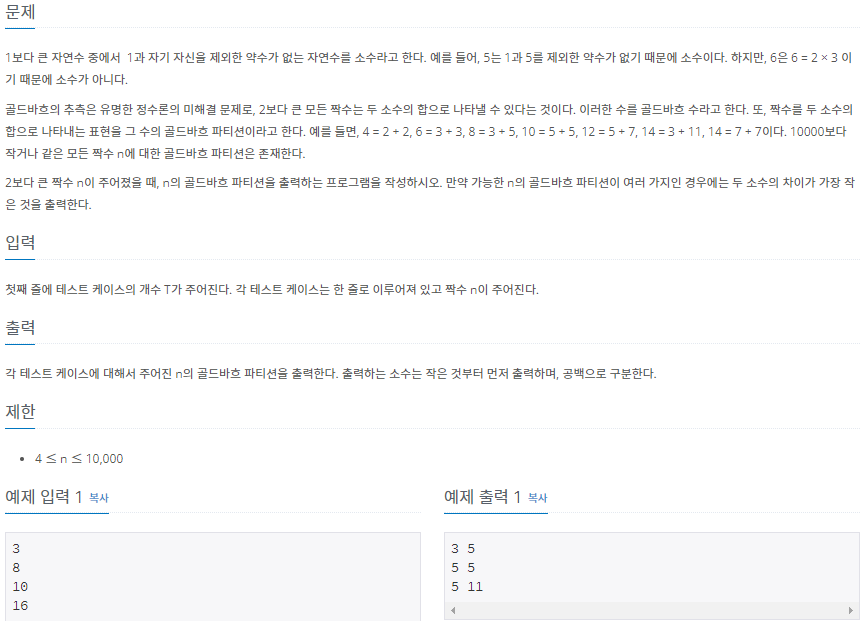 단계별로 풀어보기 - 수학 2단계 - [5단계] 9020번 문제 문제 링크 : www.acmicpc.net/problem/9020 9020번: 골드바흐의 추측 1보다 큰 자연수 중에서 1과 자기 자신을 제외한 약수가 없는 자연수를 소수라..