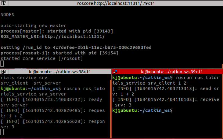Service Demo 패키지 생성 이번에는 service를 이용하는 패키지를 만들어보도록 하겠습니다. client에 인자로 전달된 두 int64 값을 server가 더하여 반환하는 데모입니다. catkin_create_pkg ros_tutorials_servi..