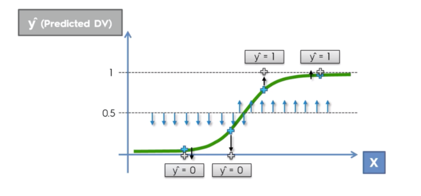 최종 예측 값은, 0.5를 기준으로 두 개의 부류로 나눈다. 그 값은 0 과 1 이다.