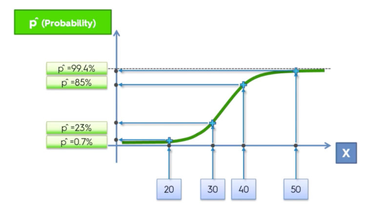 위의 시그모이드 함수를 적용한 그래프를 보면 20대는 클릭할 확률이 0.7%, 40대는 85%, 50대는 99.4%이다.