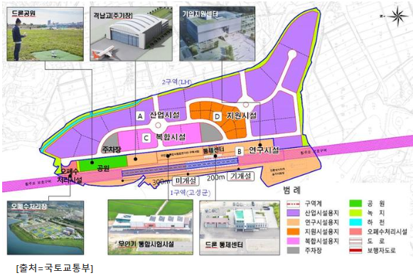 고성 무인기종합타운 투자선도지구는 드론비행장 등 현재 구축된 무인기시설과 연계하여 무인기 관련 연구개발, 제작, 시험비행 등 전 단계가 집적된 산업단지를 조성하는 사업이다.