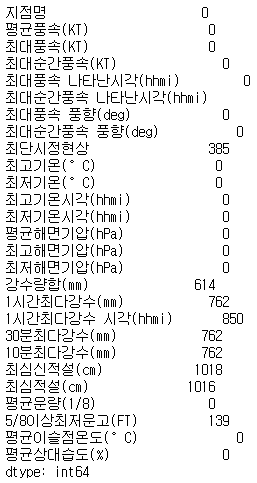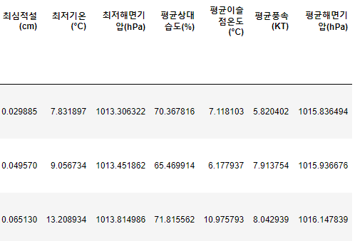 alldata = alldata.drop(['최대풍속 나타난시각(hhmi)','최대순간풍속 나타난시각(hhmi)','최고기온시각(hhmi)','최저기온시각(hhmi)','1시간최다강수 시각(hhmi)','평균운량(1/8)'], axis=1)