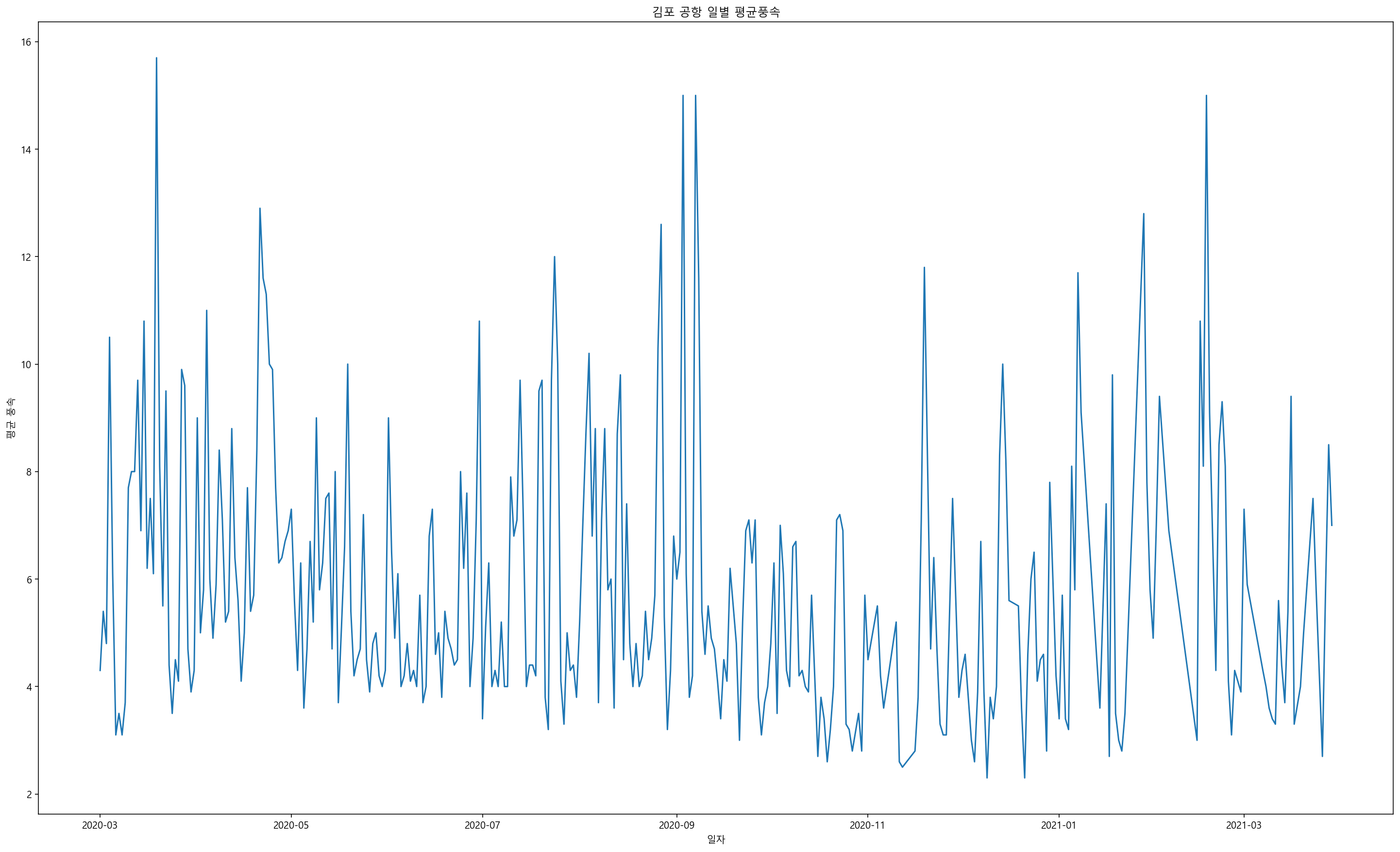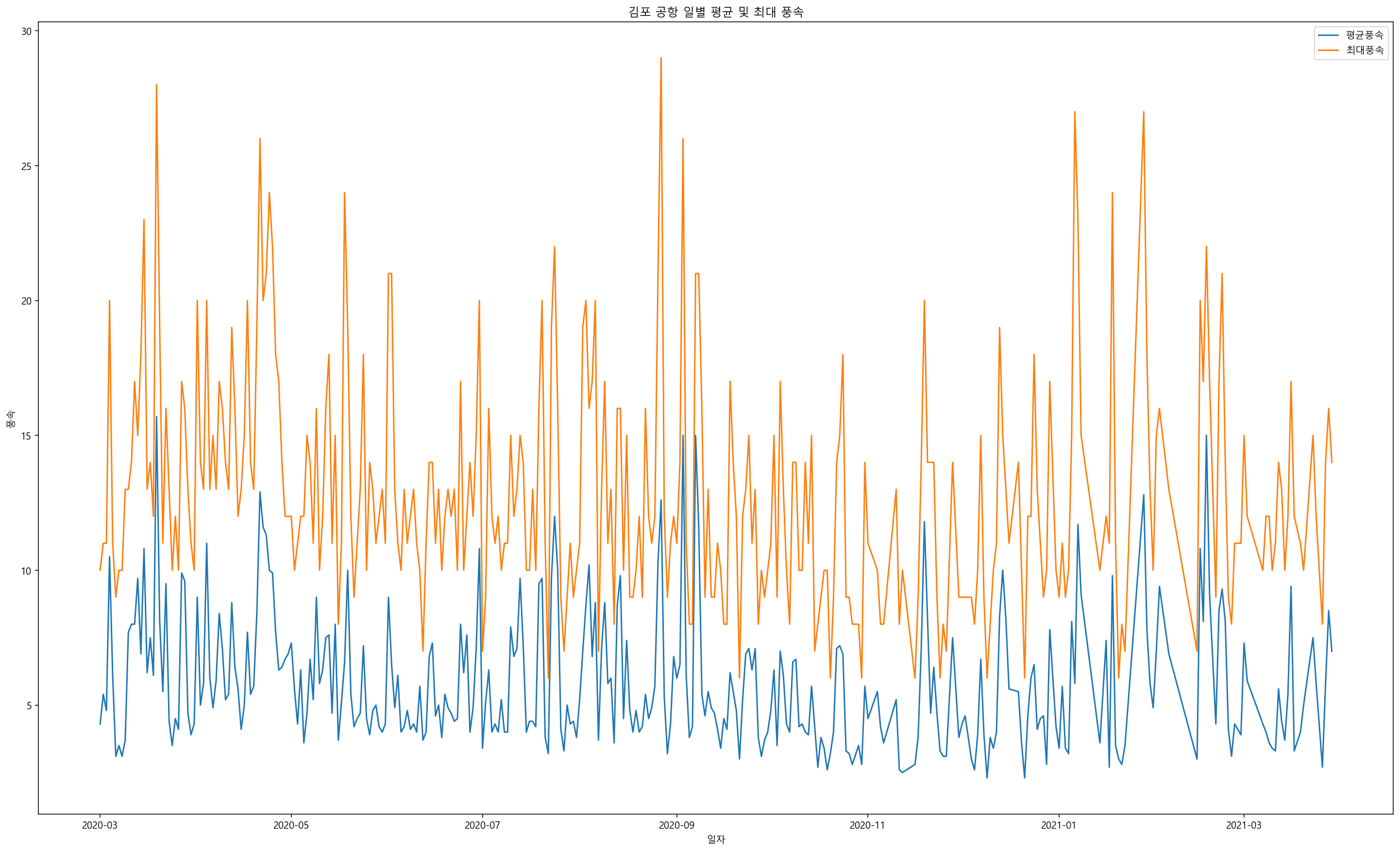 plt.title('김포 공항 일별 평균 및 최대 풍속')