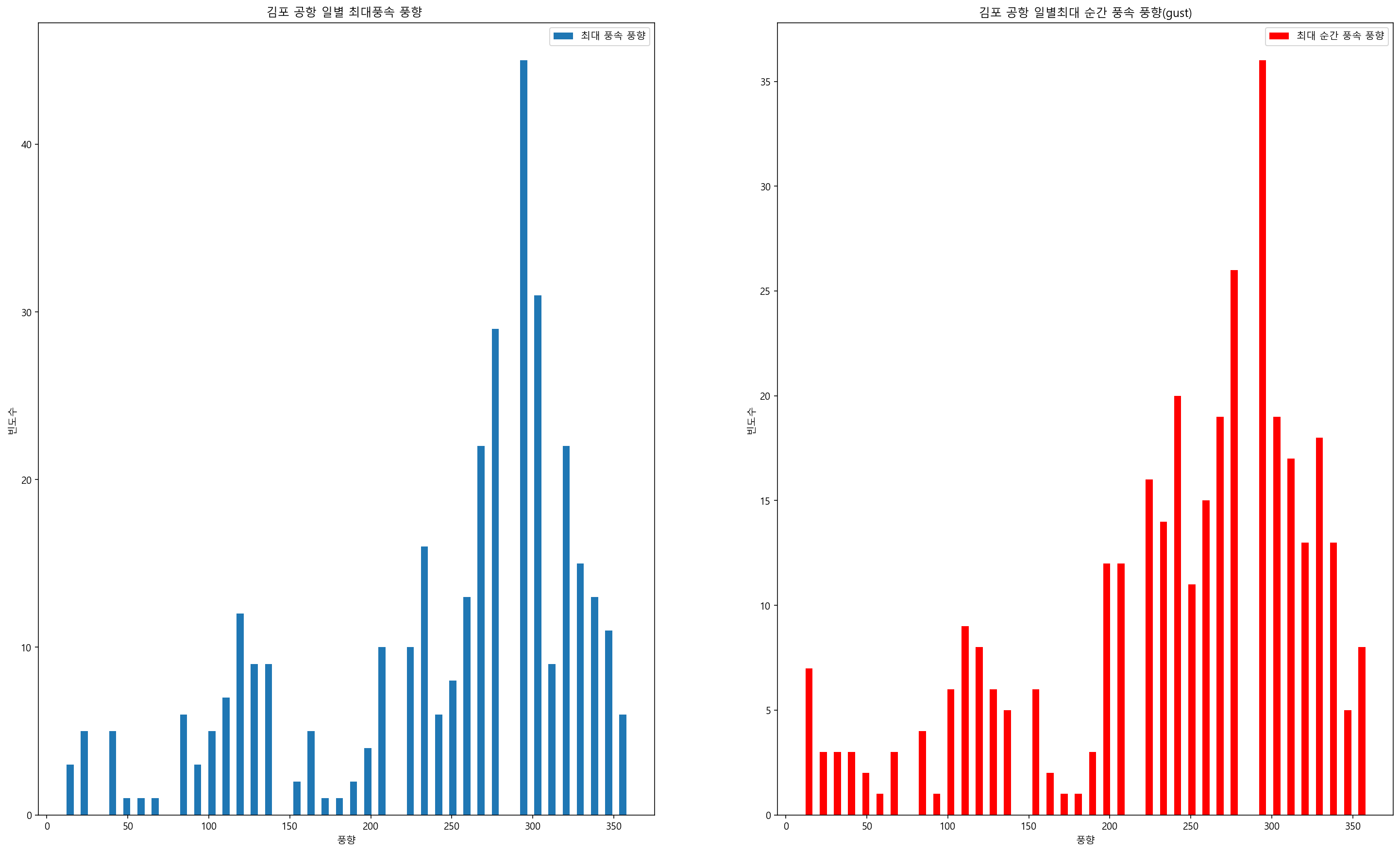 다음은 최대 풍속의 풍향과 최대 순간 풍속의 풍향을 나타내보았다.