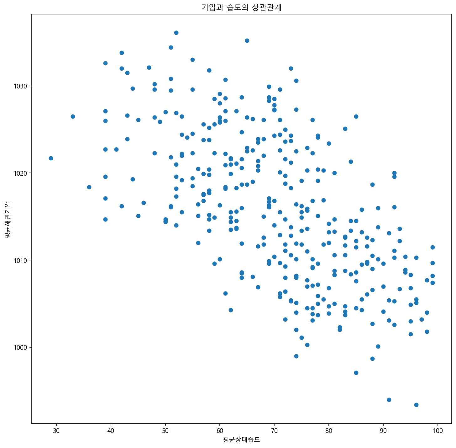 기압과 습도의 상관관계가 반비례 관계로 보여 scatter로 시각화 해보았다.