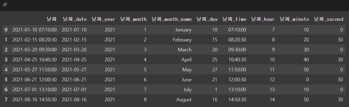 df['날짜_second'] = df['날짜'].dt.second # 초(숫자)